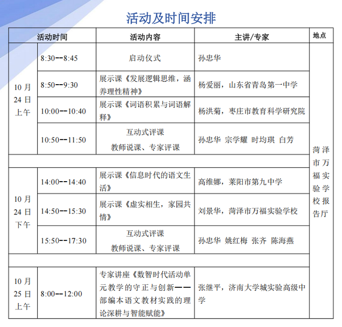 10月24日-25日,2025年高中语文学科省级工作坊现场培训会在菏泽市万福实验学校报告厅顺利开展,来自全省各市的高中语文教师共计500余人参加活动,共同开启一场关于“数智赋能教师专业发展”的高中语文盛会。