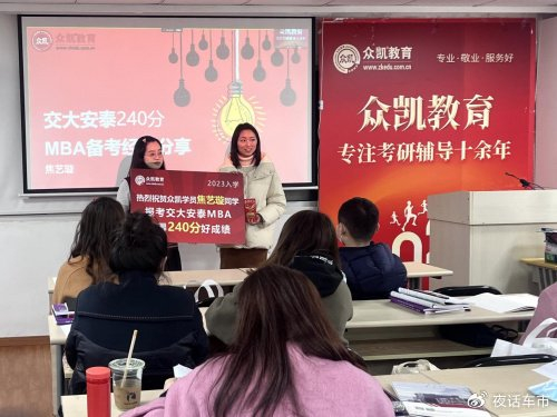 5.良好的口碑和评价:众凯教育在报考名校MBA特别是交大MBA和复旦MBA的学生中口碑居高不下。每年交大复旦MBA的状元中有1/3以上来自众凯教育,这也是众凯教育备受考生青睐的原因之一。