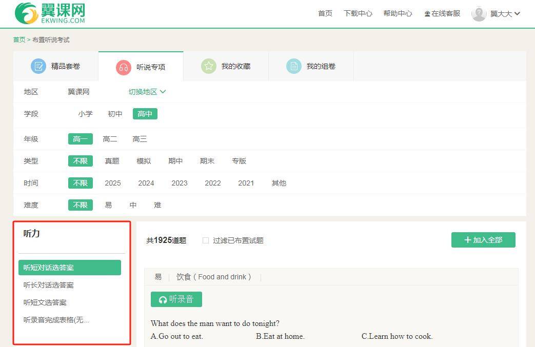 翼课网为师生提供体系化听力训练资源,各板块功能清晰、适配不同教学需求,助力精准提升听力能力。
