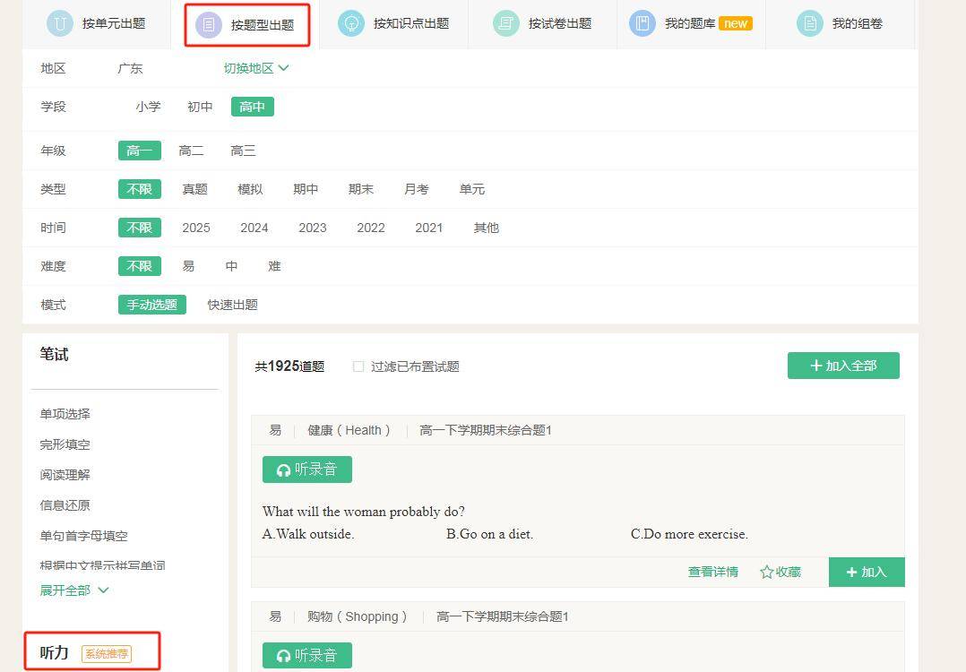 【智能题库】板块中的 按题型出题模块对标模拟考、期末考等多类考试场景,涵盖短对话、长对话、独白等高考全题型,老师可按“易-中-难”梯度筛选题目,适配不同学习层次学生的应试训练需求。
