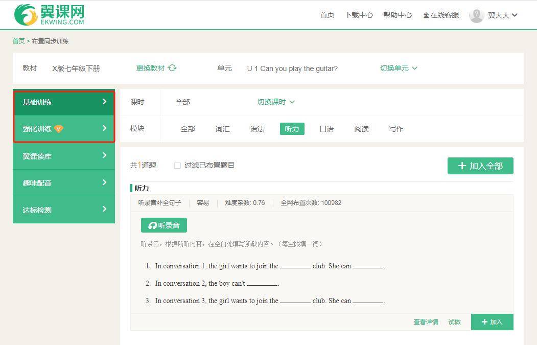 【同步训练】板块中的基础训练、强化训练、达标检测三大模块,均设置听力训练。老师可根据单元教学进度,为学生选择推送合适的听力题目,巩固课堂知识也提高听力水平。
