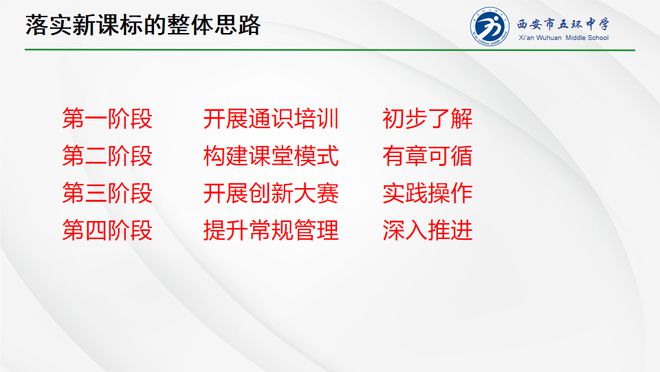王主任详细介绍了五环中学新课标下的“五环节——任务驱动式”课堂模式,从模式构建的背景原则、理论依据、路径方法、推广实践等方面都进行了解读。在“五环节——任务驱动式”课堂模式的引领下,五环中学的课堂建设取得了可喜的成绩,在灞桥区创新课大赛中,连续两年蝉联第一。王主任与会场老师分享了学校在创新课大赛的组织工作以及在参赛备赛、教学改革等方面的方法与经验。
