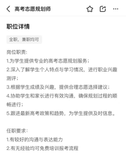 市场需求扩大催生了“高考志愿规划师”这一热门职业转型方向,但行业准入门槛相对较低。记者在招聘平台发现,相关职位要求多为“一年以上经验”或“无经验可培训”,强调沟通能力,部分岗位要求具备营销能力。