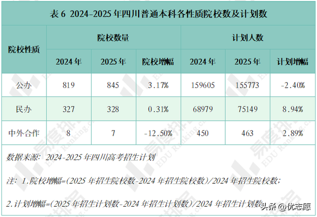 今年公办、民办院校数量较去年有所增加,中外合作院校由8所减少为7所。民办、中外合作院校招生计划数量均有增长,民办院校计划增幅最大,为8.94%,公办院校计划人数较去年减少3800余人,降幅2.4%,全省招生计划减少部分全部来自公办院校。
