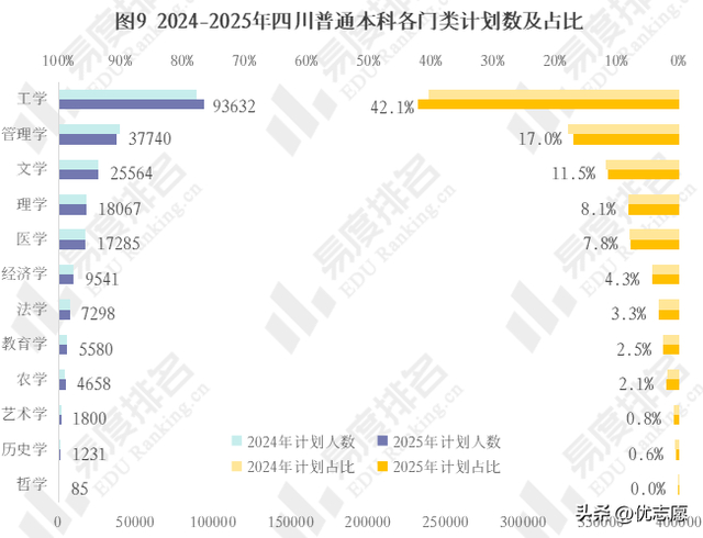 数据来源:2025年四川高考招生计划注:1.仅统计普通本科专业招生计划,未统计试验班招生计划数;2.计划占比=该门类招生计划数/招生计划总数