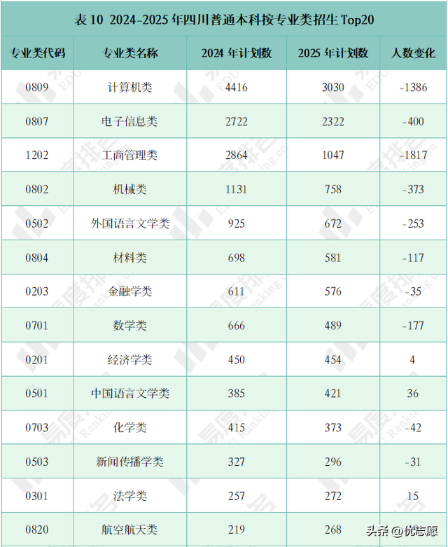 今年招生计划数前20的专业类中,有15个专业类计划人数较去年减少,其中计算机类、工商管理类计划数减少超1300个。