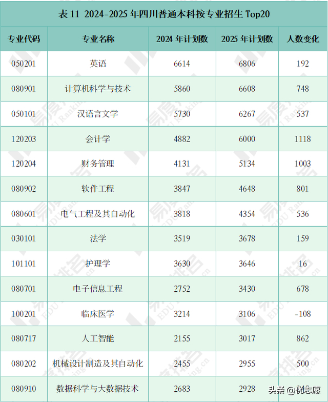 今年招生计划数前20的专业中,财务管理、会计学等专业扩招超1000人,土木工程、临床医学专业招生计划有所缩减。