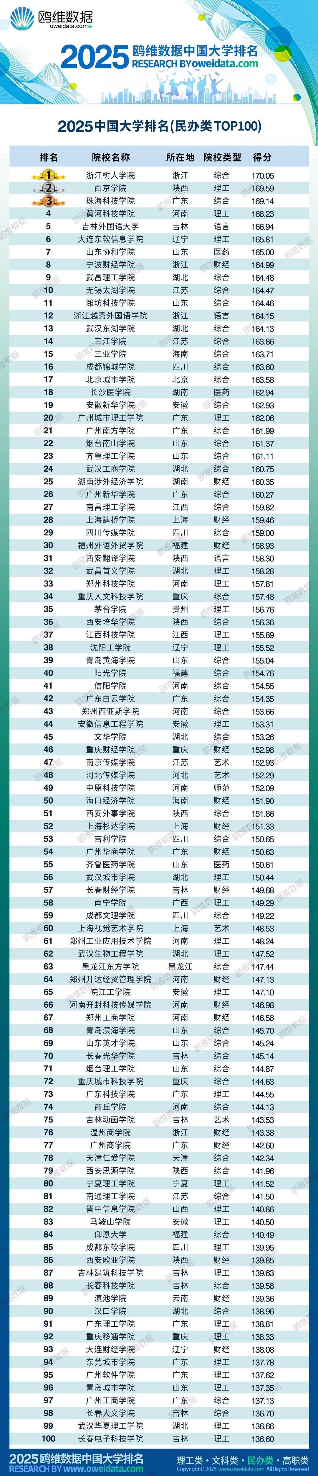 我们看到,在『2025鸥维数据中国大学排名(民办类)』百强榜单中,浙江树人学院、西京学院和珠海科技学院位居前三名。黄河科技学院、吉林外国语大学、大连东软信息学院、山东协和学院、宁波财经学院、武昌理工学院和无锡太湖学院跻身前十位。上榜的民办大学大多都是在全国有名的民办大学。
