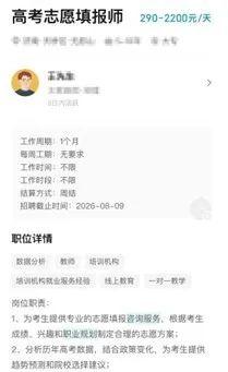 近日,记者在BOSS直聘、智联招聘等平台上以“高考志愿填报”等相关信息为关键词检索发现,兼职招聘的工作时长多为1—2个月左右,且多数招聘者对该岗位设置的招聘要求并不高,学历和经验都不限,也有部分招聘者将学历要求设置为大专或不限,任职要求则为能够使用电脑办公软件。