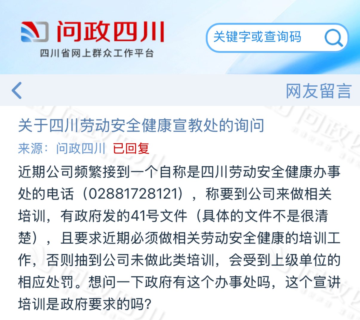 但让张女士犹豫的是,公司相关负责人今年已经接受新津工业园区管委会统一安排,依法参加了职业卫生培训并取得了培训合格证,这种反复培训有无必要?带着疑虑,张女士选择在“问政四川”平台咨询,想知道培训方是不是正规机构。