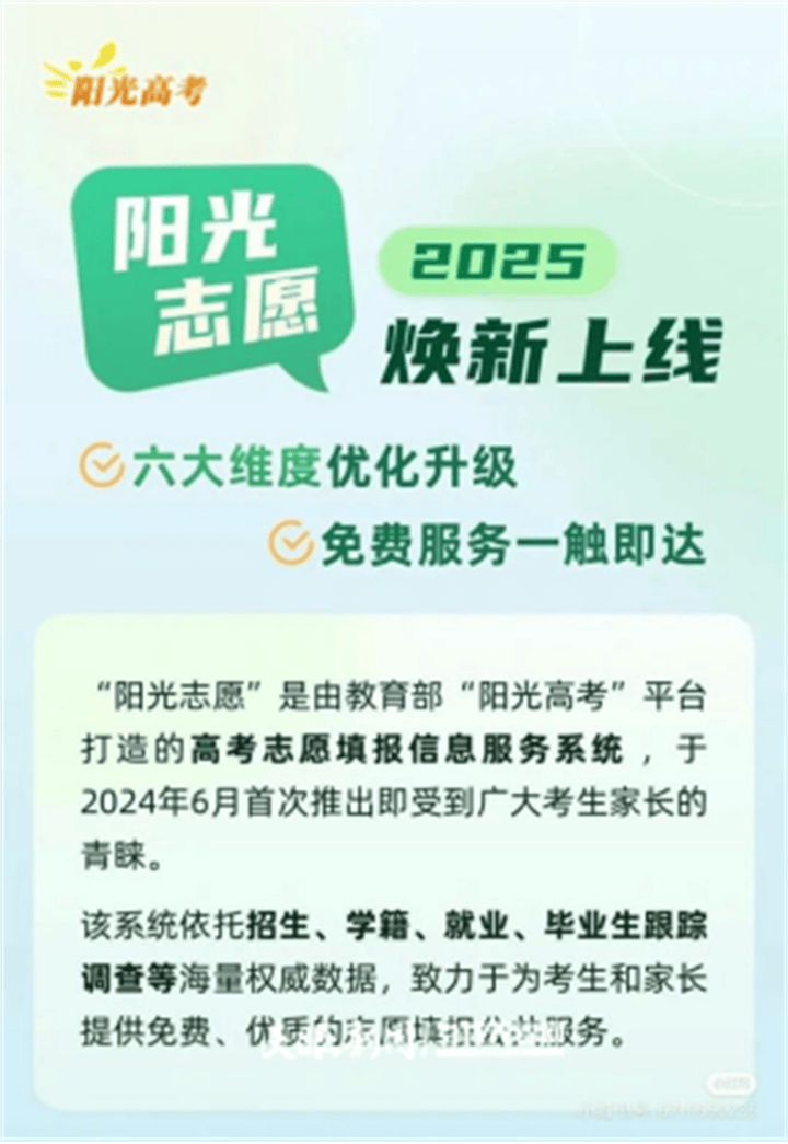 去年,教育部阳光高考招生平台上线了“阳光志愿”信息服务系统。该系统依托招生、学籍、就业、毕业生跟踪调查等海量权威数据,致力于为考生和家长提供免费、优质的志愿填报公共服务。今年,教育部阳光志愿进行了六大维度的优化升级,包括覆盖31个省份本专科批次、推进移动端适配升级、上线“智慧小招”AI助手、首推8项就业状况指标、新增高中选科参考功能模块等,让志愿填报服务更智能、更高效。