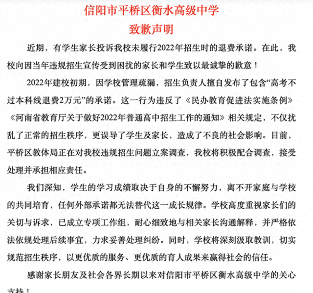 相关学校发布的致歉声明。图源网络 此前,大象新闻报道,接到信阳市民牛先生的投诉,反映该校虚假招生问题。牛先生称,“该校2022年招生时承诺家长,若中考成绩满360分,三年后高考不过本科线退还费用2万,目前学校不履行承诺。”据牛先生介绍,他的孩子2022年的中招成绩大概420多分,到该校学习,每年的花费大概2.5万元,今年的高考成绩只有433分,适用该公告。”
